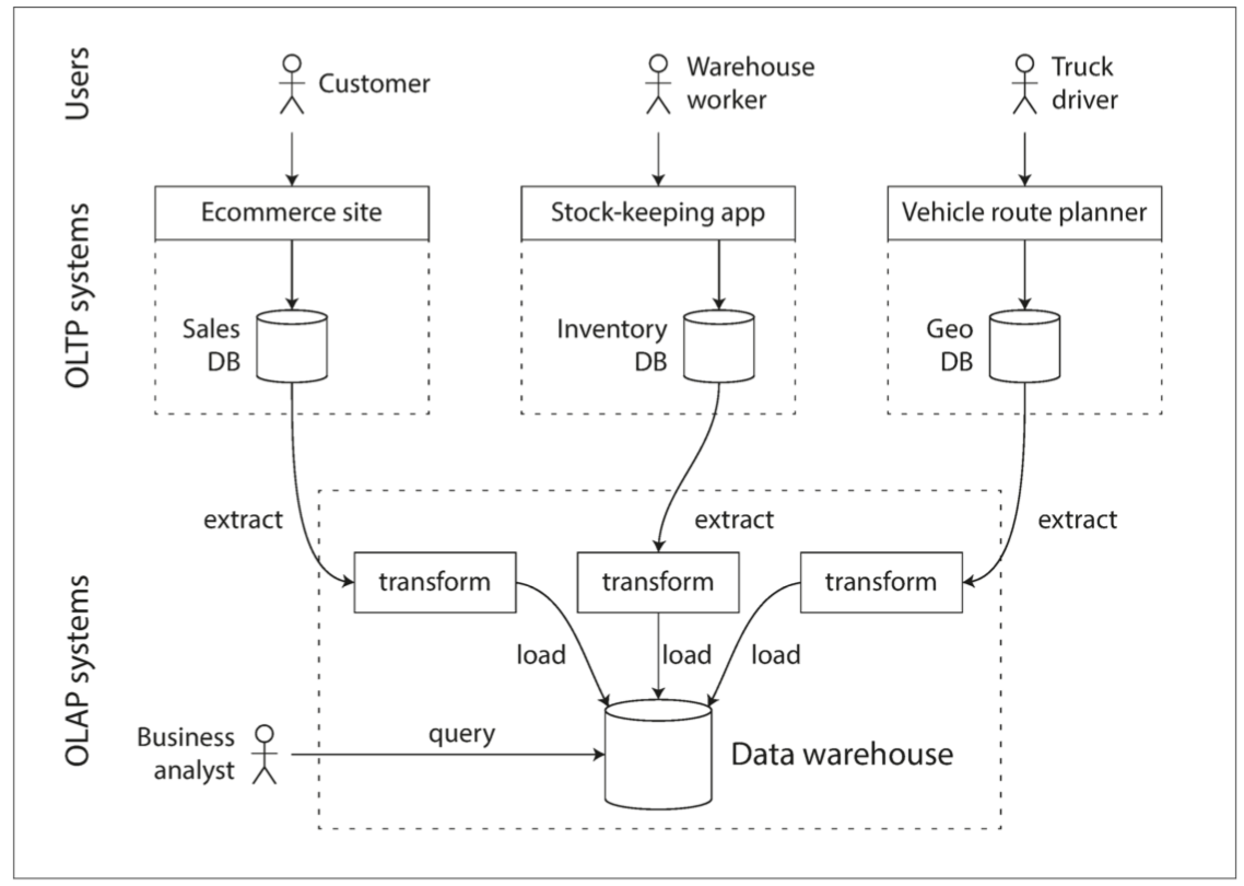 - 数据仓库和类似的分析系统主要由业务分析人员使用。通常每个查询开销高昂,需要在短时间内扫描数百万条记录。磁盘带宽(而不是查找时间)往往是瓶颈,列式存储是这种工作负载越来越流行的解决方案。