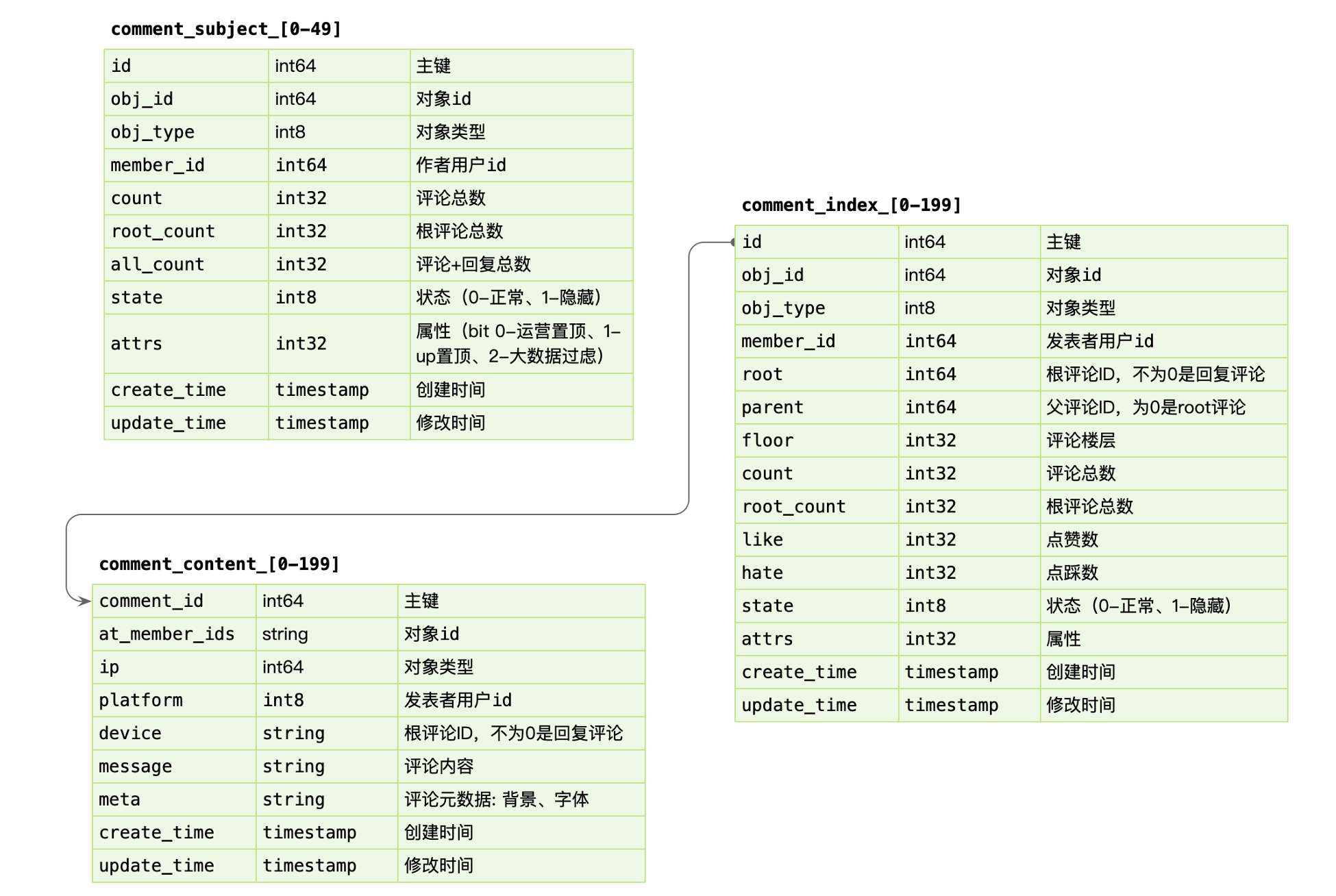 基于 obj_id + obj_type 在 comment_index 表找到评论列表,WHERE root = 0 ORDER BY floor。