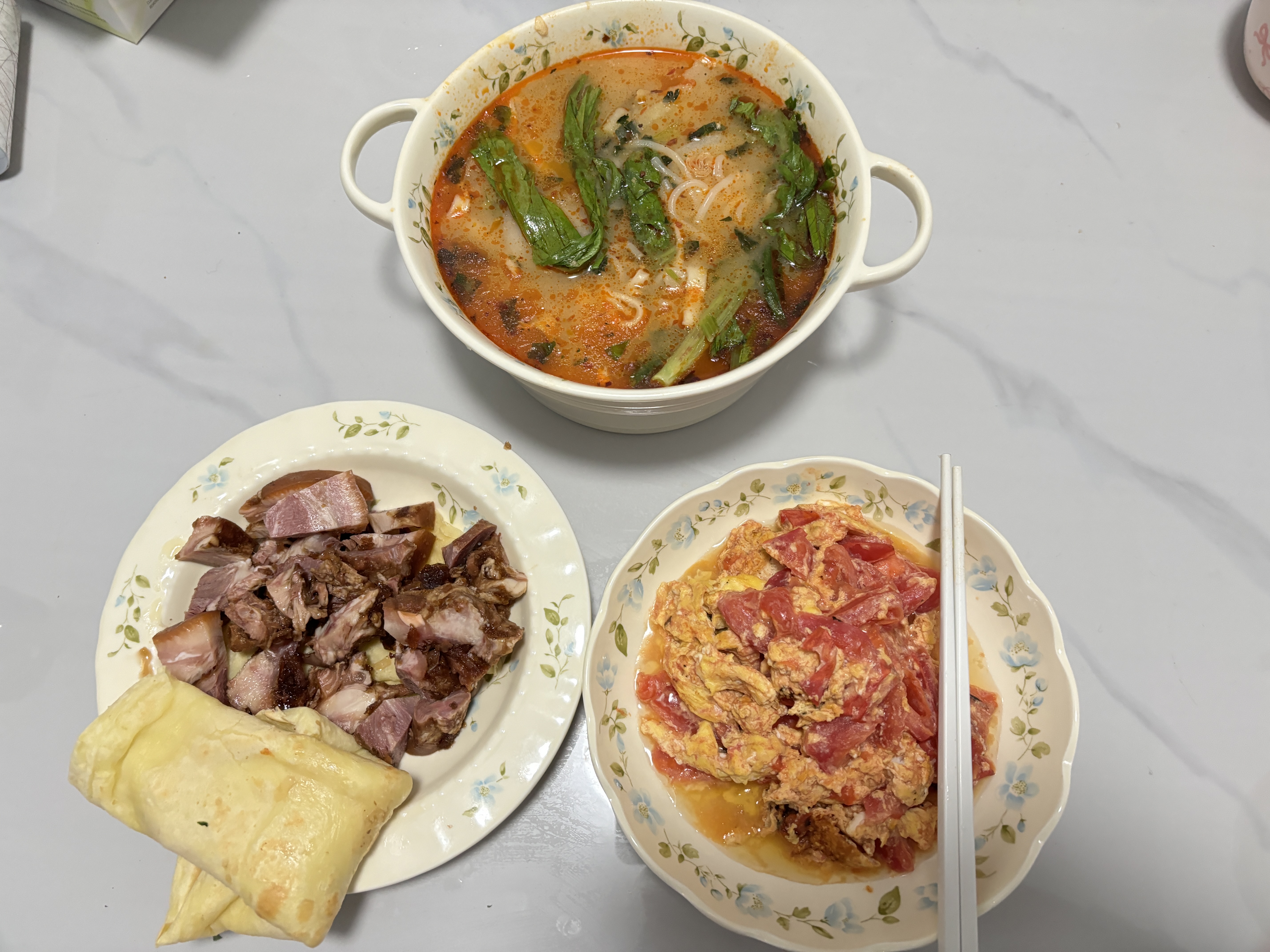 | 晚上 | 晚饭做了西红柿鸡蛋,麻辣烫,鸡蛋饼卷猪头肉,蛮满足的 | - |