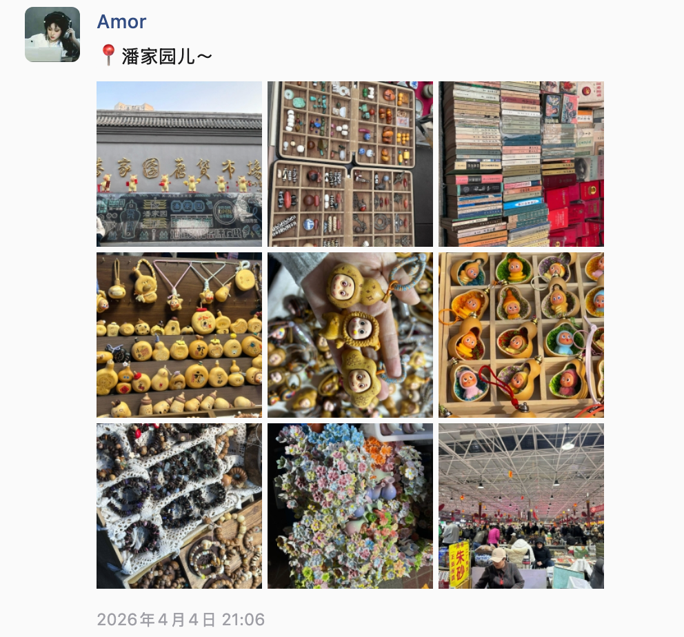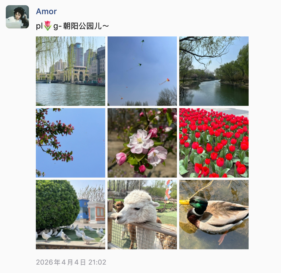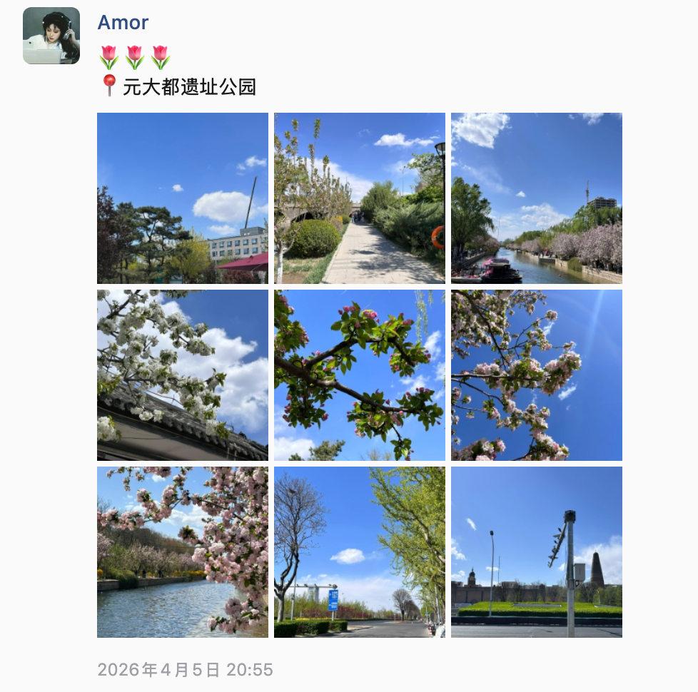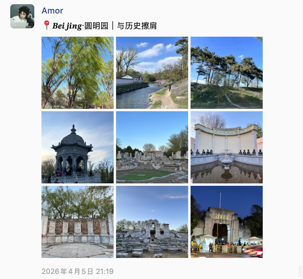 2026-清明 公园散步,感受阳光 经历 日期 事件 备注 图片 04.03 王彤请假来北京;带了很多吃的,行李很重;见面王彤说她心跳噗通噗通的 - - 04.04 早上:小谷姐姐麻辣烫;中午:出发去朝阳公园;出公园后去商场吃的米村拌饭;做地铁去潘家园,看了眼镜,在古玩市场买了星星人;晚上回来泡面吃 - 04.05 早上: 西四包子铺 中午: 元大都遗址公园 下午:突发奇想去了圆明园晚上回来精疲力尽了,吃了小区门口的眉州小吃 - 04.06 早上: 小谷姐姐麻辣烫;中午: 打卡赵雷的《十九岁》提到的地名:南锣鼓巷下午: 点了外卖俏湘厨晚上: 送王彤去地铁站;王彤打车回家 - - 备注 准备买下自拍杆,我社恐,不好意思让陌生人帮我们拍合照 身体欠佳,出门就一直留鼻涕,感觉像是花粉刺激? 准备一套睡衣,体验生活 调整作息,在王彤的带领下,已经知道早睡的秘诀了,关灯,看一会儿手机就困了 评论